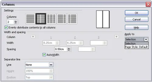 The figure below shows the Columns dialog box for a selection. Notice that the Apply to box on the right-hand side has Selection highlighted and an extra checkbox (Evenly distribute contents to all columns) appears in the upper left-hand part of the dialog box.