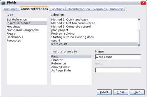 - In the Fields dialog box, on the References page, select Insert Reference in the Type list on the left hand side. The Selection list in the middle column shows only the reference field names for the subdocument you are using, so ignore that list and check the list you created manually in step 1.