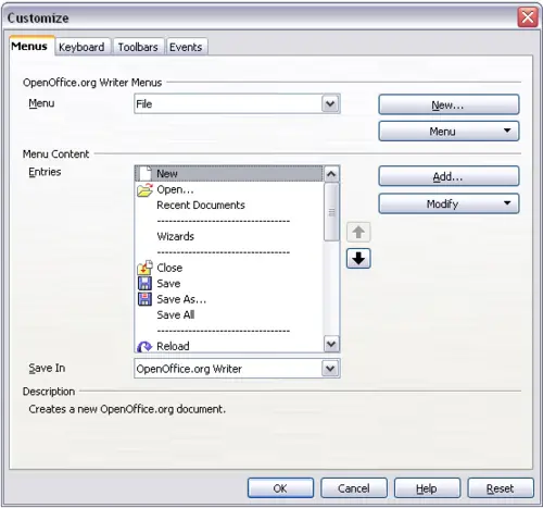- In the section OpenOffice.org <name of the program (example: Writer) > Menus, select from the Menu drop-down list the menu that you want to customize. The list includes all the main menus as well as sub-menus, that is menus that are contained under another menu. For example, in addition to File, Edit, View, and so on, there is File | Send and File |Templates. The commands available for the selected menu are shown in the central part of the dialog.