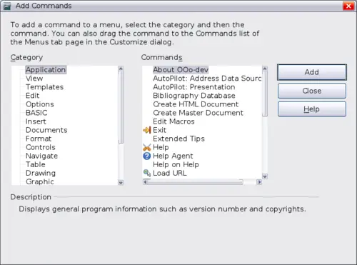 On the Add Commands dialog, select a category and then the command, and click Add. The dialog remains open, so you can select several commands. When you have finished adding commands, click Close. Back on the Customize dialog, you can use the up and down arrow buttons to arrange the commands in your preferred sequence.