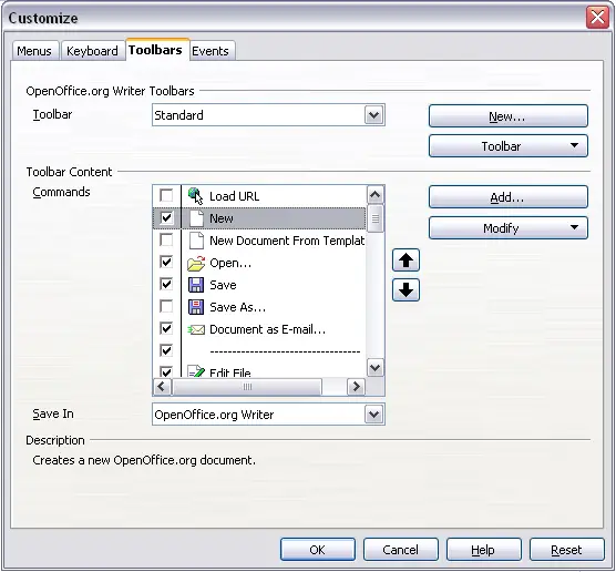 - In the section OpenOffice.org < name of the program (example: Writer) > Toolbars, select from the Toolbar drop-down list the toolbar that you want to customize.