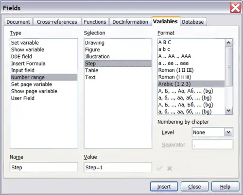 Now you may want to restart the Step sequence at 1, so you can use the same sequence name more than once in your document (for example, to begin each set of instructions). To do that, you need to insert a new field of the same name, while instructing OOo to force the value to 1.