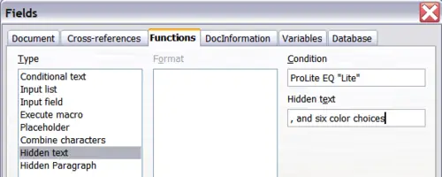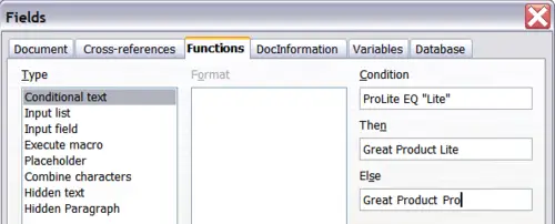 - Open the Fields dialog box by clicking Insert > Fields > Other, select the Functions tab, and select Conditional text in the Type list.
