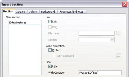 - Click Insert > Section. On the Insert Section dialog box, select the Hide checkbox and enter the condition in the with Condition box. You can also give the section a name, if you wish (strongly recommended, so you can find it again easily if you have several sections in your document).