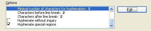 To change the minimal number of characters for hyphenation, the minimum number of characters before a line break, or the minimum number of characters after a line break, select the item, and then click Edit.