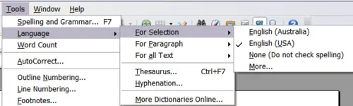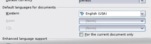 | Unlike the menu tool that applies to the individual document, a change in the default language from the Options dialog is a general change of settings of OOo and will therefore apply to all the documents created in the future. If you want to change the language for the current document only, be sure to select the For the current document only option.