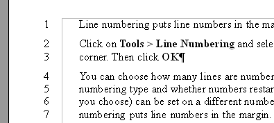 Line numbering puts line numbers in the margin. The line numbers are displayed on screen and are printed. The example below has numbering on every line.