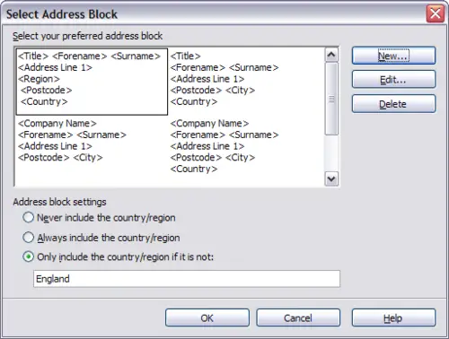 - The Select Address Block dialog box offers six choices for the format of the addresss block (scroll down to see the last two choices). You can also optionally include or exclude the country (for example, only include the country if it is not USA). The six formats provided are relatively common, but they might not exactly match your preference. If this is the case, select the address block that is closest to what you want and click Edit, which opens the New Address Block dialog box.