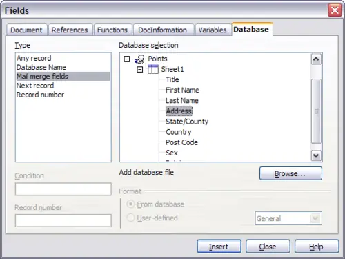 | The Database selection lists the data source you selected in step 3. All the information you need for the letter must be contained in that data source.