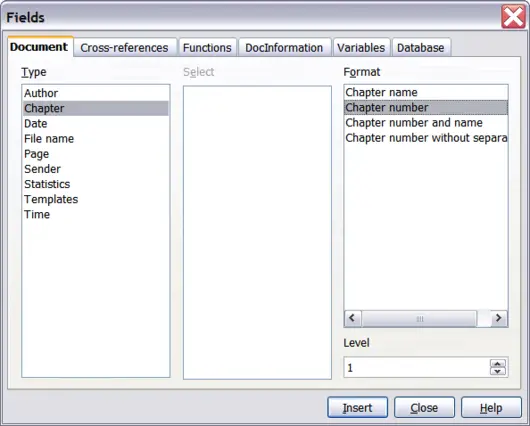 - On the Fields dialog, go to the Document page. Select Chapter in the Type list, Chapter number in the Format list, and 1 in the Layer box. Click Insert.