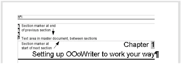 - Save the master document again. Now highlight each chapter in turn and insert a Text section before it. When you are done, the Navigator should look like Figure 8.