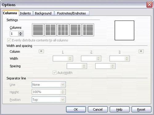 The Options dialog box has four tabbed pages: Columns, Indents, Background, and Footnotes/Endnotes. To learn how to use these pages, see: