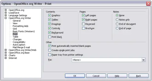 - Choose Tools > Options > OpenOffice.org Writer > Print. The dialog box shown below opens.