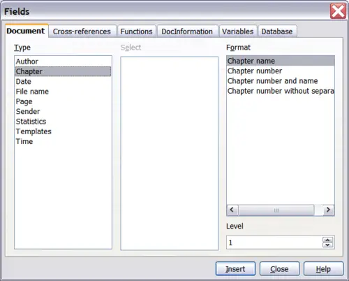 - If you have used Heading 1 for your chapter titles, you can use a document field to insert the current chapter title, so the headers or footers contents changes from one chapter to the next. (Writer calls chapter titles Chapter names.) If you have used outline numbering on your Heading 1, you can choose whether to include these numbers in the field (Chapter number and name).