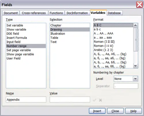 - Define and insert a second number range variable for the appendixes, using Number range, Appendix, A B C), as shown below. Type Appendix<space> and then insert the variable. Do this for each Heading 1 that is to be an appendix title.
