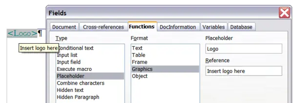 - On the Functions tab of the Fields dialog box, select Placeholder in the Type column and select what the placeholder is for in the Format column.