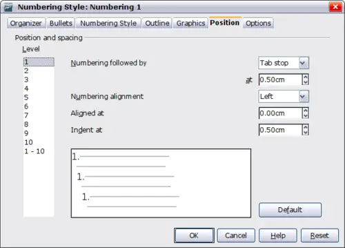 Use the Options page to alter the style of all the outline levels. The options available on this page depend on the type of marker selected for the list. Select first the level you want to modify on the left hand side of the box. To modify all ten levels at once, select 1 – 10 as the level. If you started from a predefined outline, some of the levels will already have settings.
