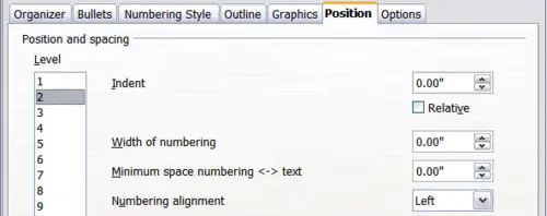 - Width of numbering: this value determines how much space is used by the numbering symbol. Writer reserves this space, even if only part of it is used.