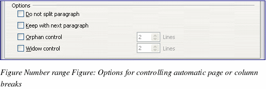 The Options section of the Text Flow page (Figure 200) of the Paragraph Style dialog box provides settings to control what happens when a paragraph does not fit on the bottom of a page: