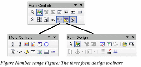 The Form Design toolbar can also be launched from the Form Controls toolbar. Some of the less commonly used controls are on a third toolbar—More Controls—also launched from the Form Controls toolbar.