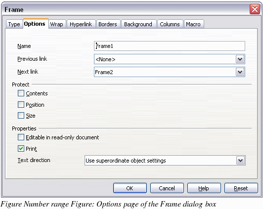 The Options page of the Frame dialog box (Figure 93) shows the names of the selected frame and any frames it is linked to or from. You can change this information here. On this page, you can also select check boxes to protect the contents, position, and size of the frame.