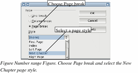 The idea is simple: you break a sequence of page styles and start a new sequence. To insert a page break, choose Insert > Manual Break and choose Page break. This section illustrates two scenarios where page breaks are useful.