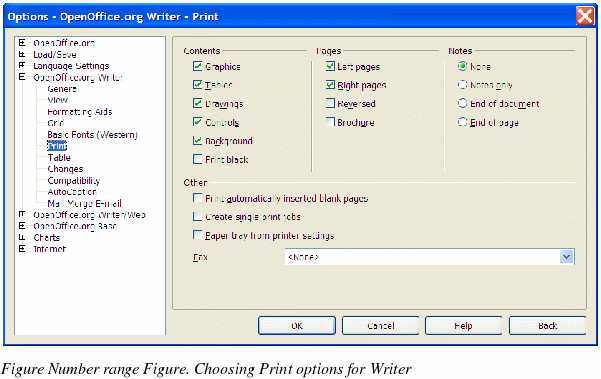 On the OpenOffice.org Writer – Print page (Figure 36), you can choose which items are printed with the document by default. These options are in addition to those on the OpenOffice.org – Print page (Figure 29).