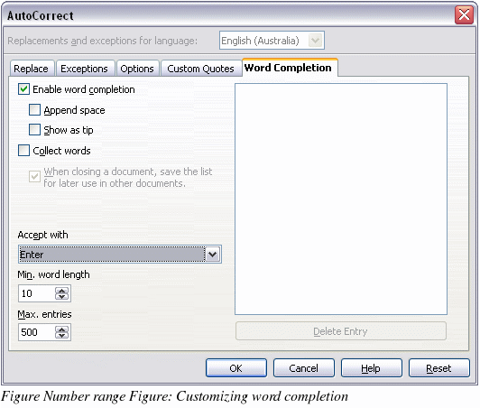 You can customize word completion from the Tools > AutoCorrect > Word Completion tab (Figure 67):