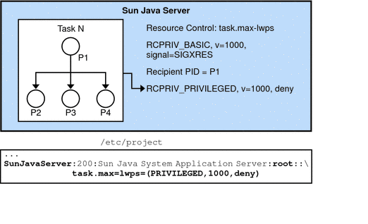 Because the task's limit is privileged, the application cannot change the limit, or specify an action, such as a signal. A master process solves this problem by establishing the same resource control as a basic resource control on the task. The master process uses the same value or a little less on the resource, but with a different action, signal = XRES. The master process creates a thread to wait for this signal.