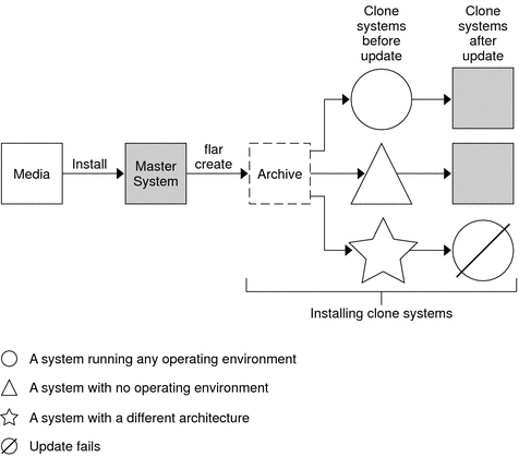When you install the Solaris Flash archive on a system, all of the files in the archive are copied to that system. The newly installed system now has the same installation configuration as the original master system, thus the system is called a clone system. Some customization is possible: