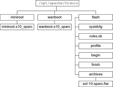 Figure 10-1 shows a basic sample structure for a document root directory. In this example, the WAN boot server and install server are on the same machine. The server is running the Apache web server software.