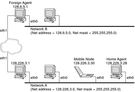 foreign network, Network B. Datagrams that are destined for the mobile node are