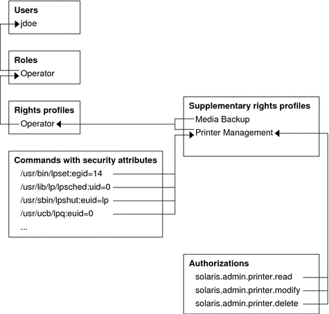 Figure 8-2 Example of Solaris RBAC Element Relationships