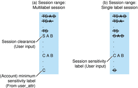 user can work at a label of CONFIDENTIAL, CONFIDENTIAL A B, or SECRET A B.