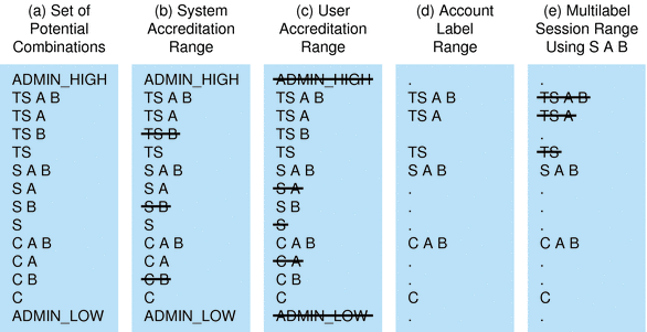 The fifth column of Table 1-1 shows an account with a clearance of TS and a minimum label of C. This account would be allowed to work only with TS, S, and C labels, because all the other valid labels that are dominated by TS include the words A and B. A and B are not in the clearance.