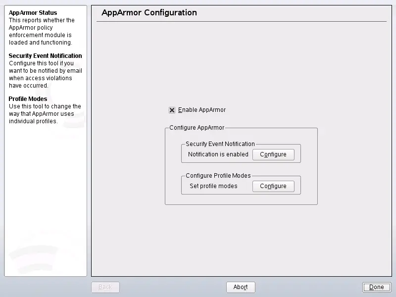 To change the status of Novell AppArmor, continue as described in Changing Novell AppArmor Status.