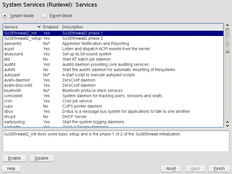After starting this YaST module with YaST > System > System Services (Runlevel), it displays an overview listing all the available services and the current status of each service (disabled or enabled). Decide whether to use the module in Simple Mode or in Expert Mode. The default Simple Mode should be sufficient for most purposes. The left column shows the name of the service, the center column indicates its current status, and the right column gives a short description. For the selected service, a more detailed description is provided in the lower part of the window. To enable a service, select it in the table then select Enable. The same steps apply to disable a service.