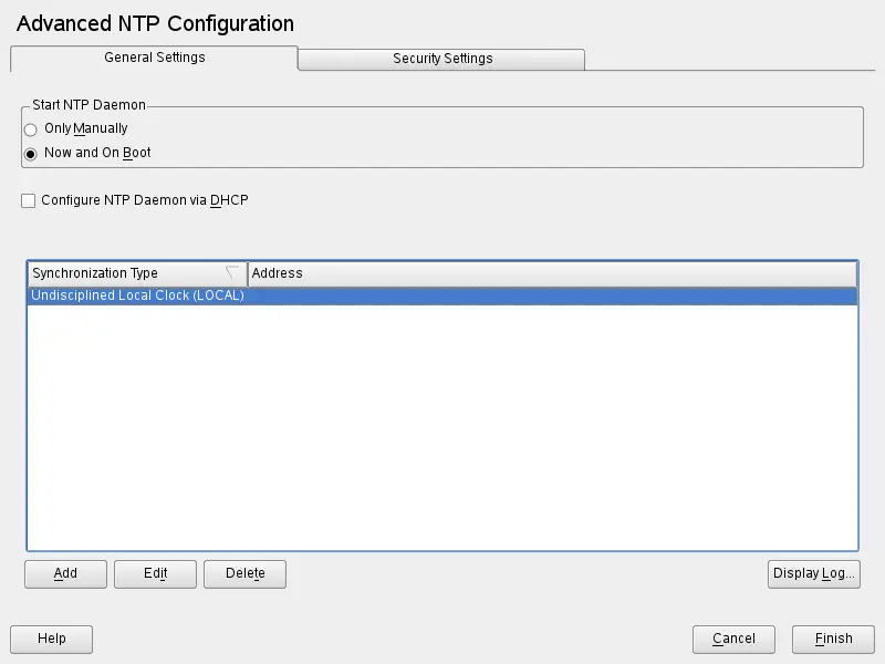 consists of two dialogs. Set the start mode of xntpd and the server to