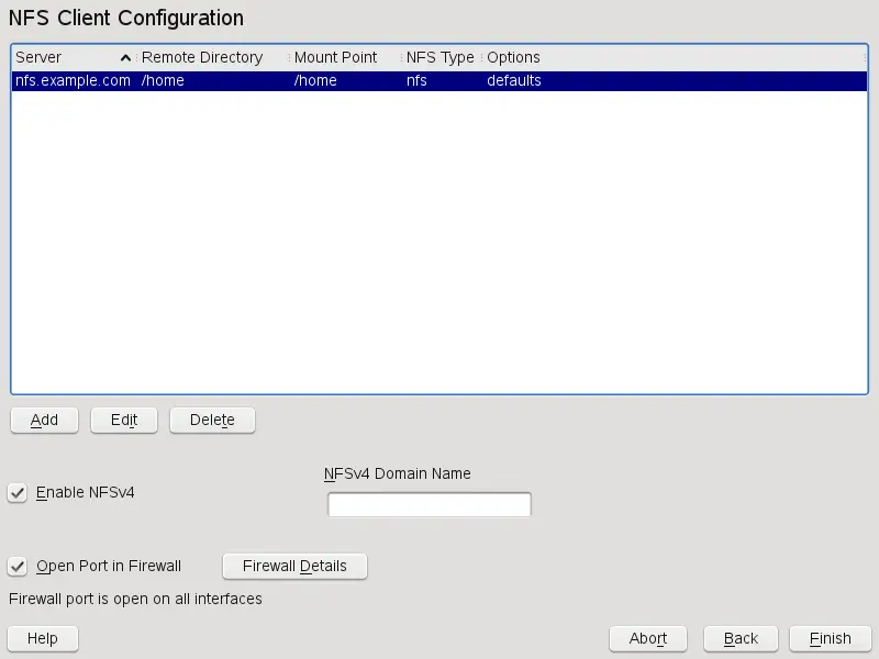 box. When using NFSv4, make sure that the checkbox is enabled, and that the contains the same value as used by the NFSv4 server. The