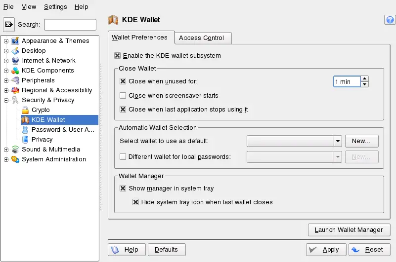 To remove the KWallet icon from the panel, deactivate . You can then only access KWallet from