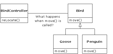 There’s a problem, however, with attempting to treat derived-type objects as their generic base types (circles as shapes, bicycles as vehicles, cormorants as birds, etc.). If a method is going to tell a generic shape to draw itself, or a generic vehicle to steer, or a generic bird to move, the compiler cannot know at compile time precisely what piece of code will be executed. That’s the whole point—when the message is sent, the programmer doesn’t want to know what piece of code will be executed; the draw method can be applied equally to a circle, a square, or a triangle, and the object will execute the proper code depending on its specific type. If you don’t have to know what piece of code will be executed, then when you add a new subtype, the code it executes can be different without requiring changes to the method call. Therefore, the compiler cannot know precisely what piece of code is executed, so what does it do? For example, in the following diagram the BirdController object just works with generic Bird objects and does not know what exact type they are. This is convenient from BirdController’s perspective because it doesn’t have to write special code to determine the exact type of Bird it’s working with or that Bird’s behavior. So how does it happen that, when move( ) is called while ignoring the specific type of Bird, the right behavior will occur (a Goose runs, flies, or swims, and a Penguin runs or swims)?