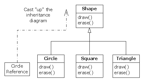 Here, a Circle object is created, and the resulting reference is immediately assigned to a Shape, which would seem to be an error (assigning one type to another); and yet it’s fine because a Circle is a Shape by inheritance. So the compiler agrees with the statement and doesn’t issue an error message.