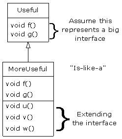 As in the diagram, MoreUseful extends the interface of Useful. But since it’s inherited, it can also be upcast to a Useful. You can see this happening in the initialization of the array x in main( ). Since both objects in the array are of class Useful, you can send the f( ) and g( ) methods to both, and if you try to call u( ) (which exists only in MoreUseful), you’ll get a compile-time error message.