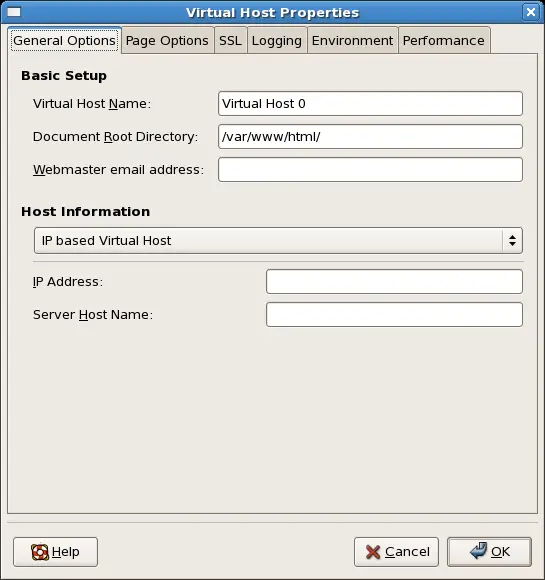 In the General Options tab, you can change the hostname, the document root directory and also set the webmaster's email address. In the Host information, you can set the Virtual Host's IP Address and Host Name. The figure below illustrates the General Options tab.