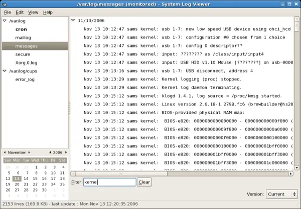 The application only displays log files that exist; thus, the list might differ from the one shown in Figure 35.1, “System Log Viewer”.