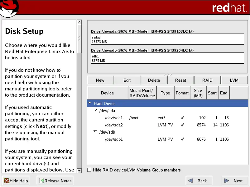 The following section explains how to manually configure LVM for Red Hat Enterprise Linux. Because there are numerous ways to manually configure a system with LVM, the following example is similar to the default configuration done in Section 9.3, “Automatic Partitioning”.