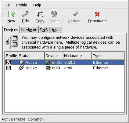 After configuring the Ethernet device —such as eth0 —to use a static IP address (DHCP does not work with aliases), go to the Devices tab and click