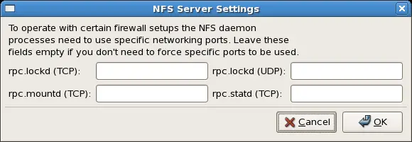 Based on certain firewall settings, you may need to configure the NFS daemon processes to use specific networking ports. The NFS server settings allows you to specify the ports for each process instead of using the random ports assigned by the portmapper. You can set the NFS Server settings by clicking on the Server Settings button. The figure below illustrates the NFS Server Settings window.