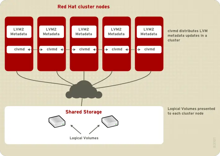 The key component in CLVM is clvmd. clvmd is a daemon that provides clustering extensions to the standard LVM2 tool set and allows LVM2 commands to manage shared storage. clvmd runs in each cluster node and distributes LVM metadata updates in a cluster, thereby presenting each cluster node with the same view of the logical volumes (refer to Figure 1.14, “CLVM Overview”). Logical volumes created with CLVM on shared storage are visible to all nodes that have access to the shared storage. CLVM allows a user to configure logical volumes on shared storage by locking access to physical storage while a logical volume is being configured. CLVM uses the lock-management service provided by the cluster infrastructure (refer to Section 1.3, “Cluster Infrastructure”).