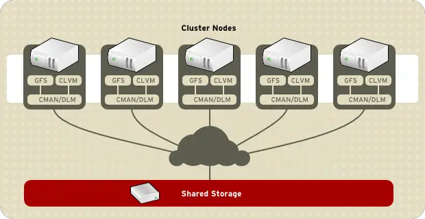 Cluster management manages cluster quorum and cluster membership. CMAN (an abbreviation for cluster manager) performs cluster management in Red Hat Cluster Suite for Red Hat Enterprise Linux 5. CMAN is a distributed cluster manager and runs in each cluster node; cluster management is distributed across all nodes in the cluster (refer to Figure 1.2, “CMAN/DLM Overview”).